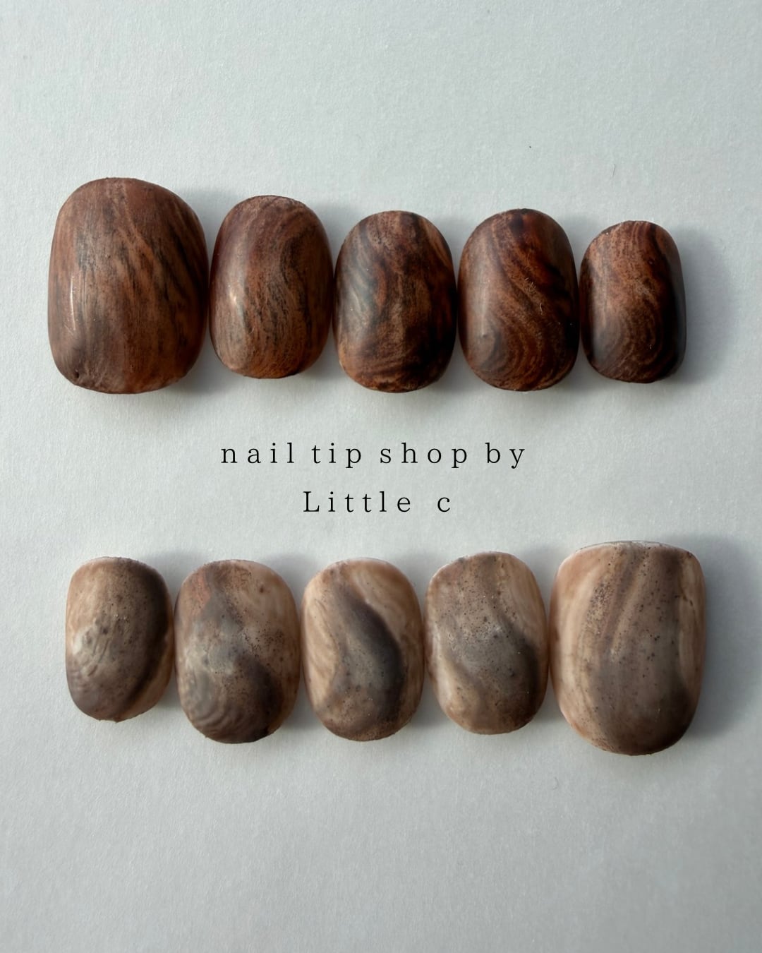 まるで本物の木のような木目デザインと、サラサラ質感のマットな表面仕上げが特徴的なネイルチップです。
